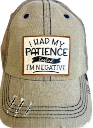 • "I HAD MY PATIENCE TESTED" DISTRESSED TRUCKER HAT (#112)