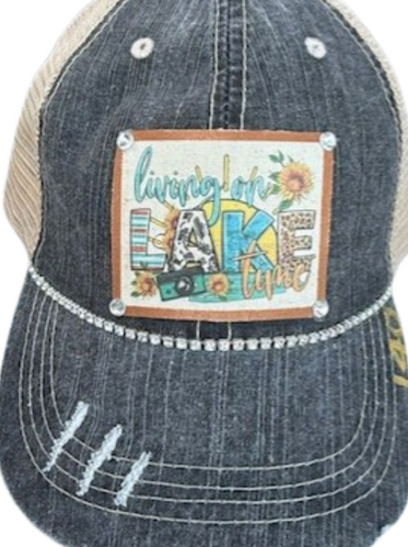 • "LIVING ON LAKE TIME" DISTRESSED TRUCKER HAT (#140)
