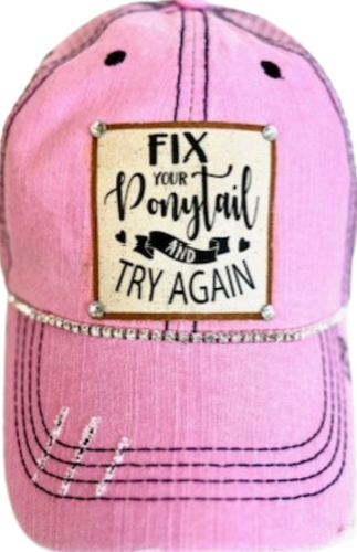 "FIX YOUR PONYTAIL AND TRY AGAIN" DISTRESSED TRUCKER HAT (#129)