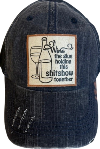 "WINE IS THE GLUE HOLDING THIS SHITSHOW" DISTRESSED TRUCKER HAT (#134)