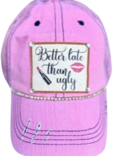 "BETTER LATE THAN UGLY" DISTRESSED TRUCKER HAT (#155)