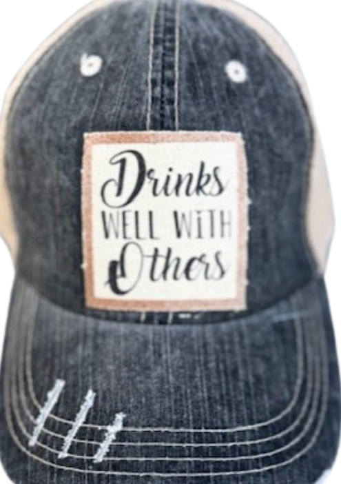 "DRINKS WELL WITH OTHERS" DISTRESSED TRUCKER HAT (#107)