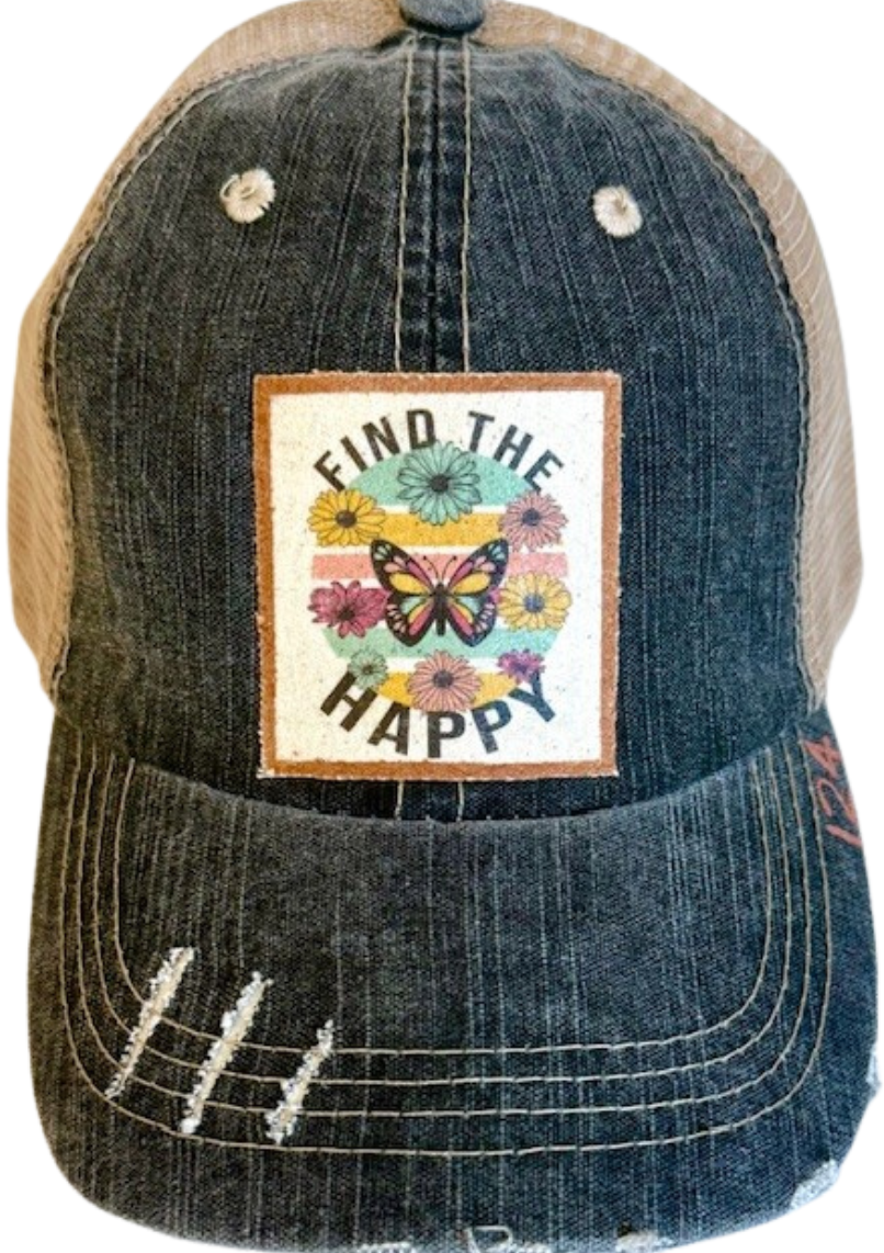 "FIND THE HAPPY" DISTRESSED TRUCKER HAT (#124)
