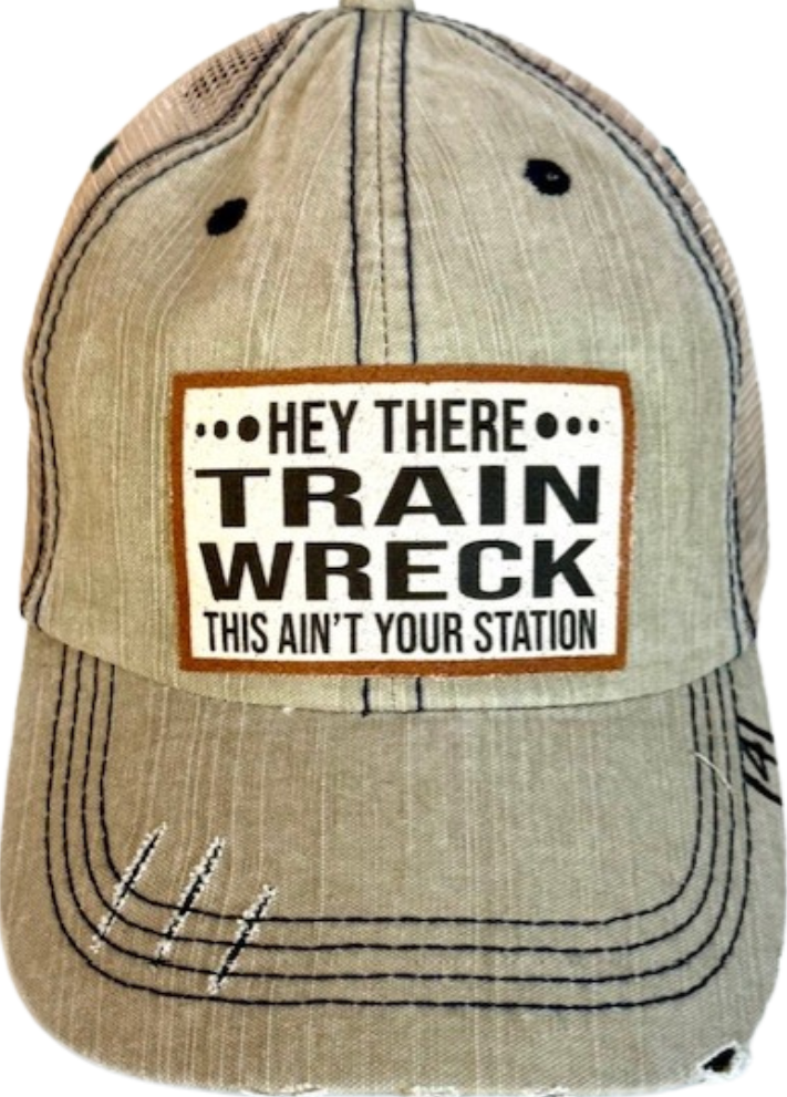 "HEY THERE TRAIN WRECK" DISTRESSED TRUCKER HAT (#141)