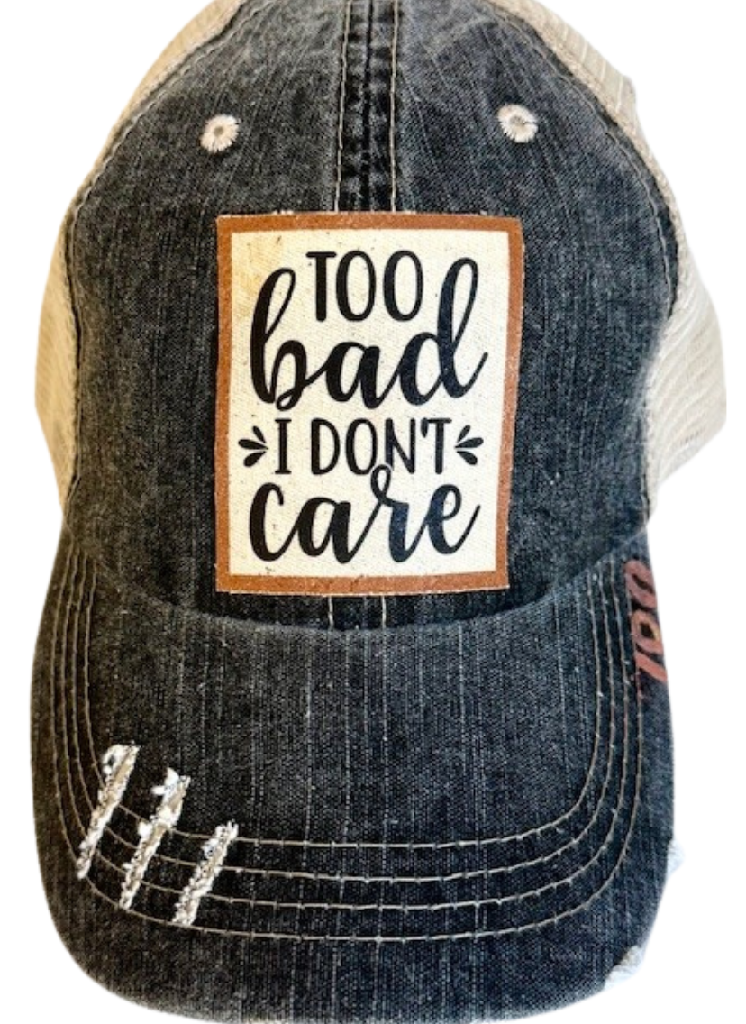 "TOO BAD I DON'T CARE" DISTRESSED TRUCKER HAT (#100)