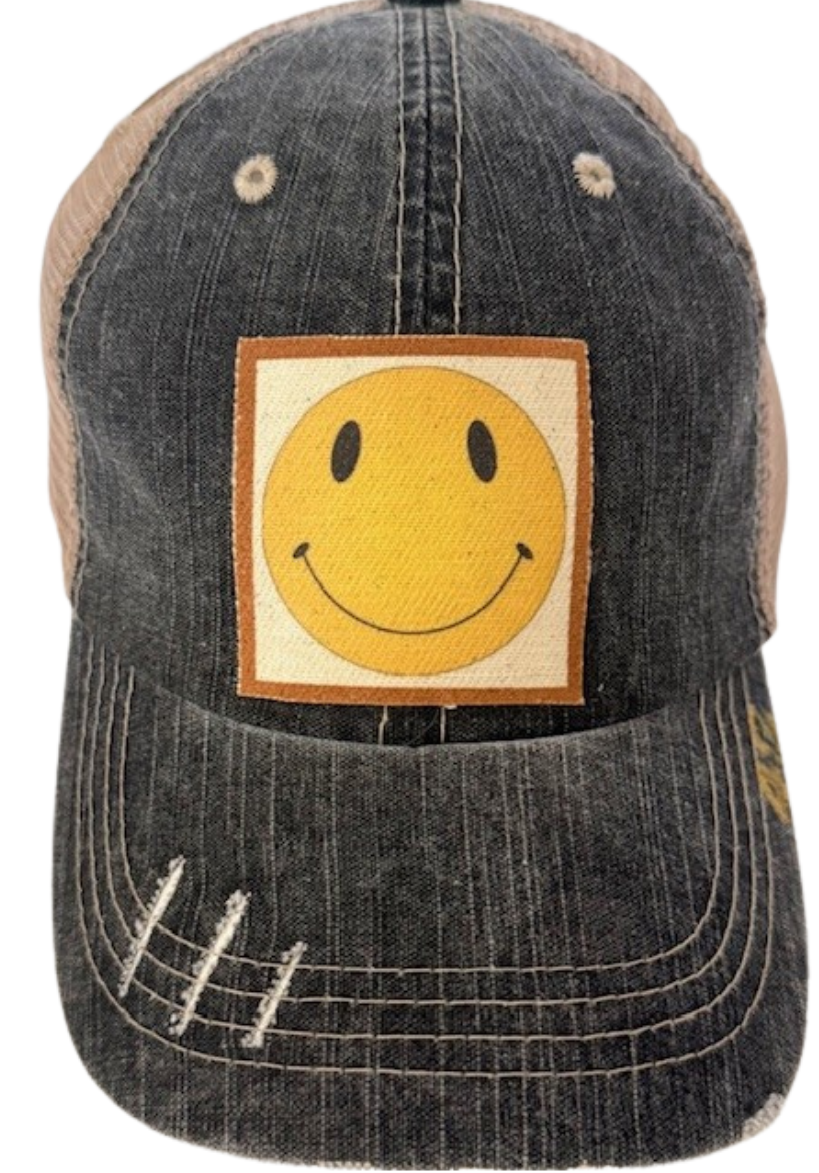 "YELLOW SMILEY FACE" DISTRESSED TRUCKER HAT (#48)
